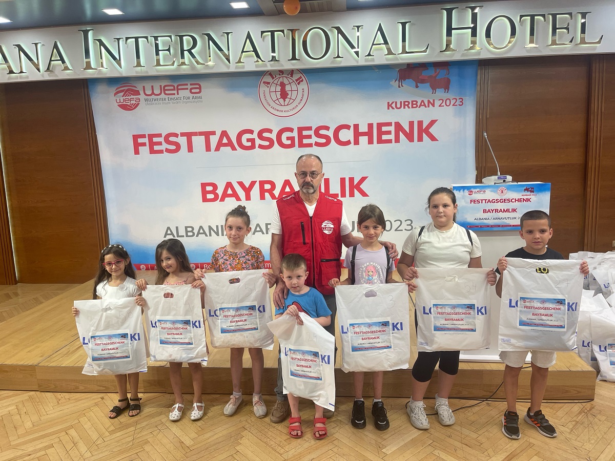 Në një ceremoni të mbajtur në ‘Tirana International Hotel’ Fondacioni ‘Alsar’ me rastin e Kurban Bajramit në bashkëpunim me partnerët e organizatës humanitare ‘WEFA’ me qendër në Gjermani dhuroi veshmbathje për 260 jetimë.Nën atmosferën festive që përçon festa e Kurban Bajramit tëk fëmijët dhe nën fjalët e ndjera të përfaqësuesit të organizatës humanitare ‘WEFA’ z. Orhan Şahin gjithçka u zhvillua në mënyrë perfekte.A mosferës festive ju shtua edhe grupi artistik i valleve popullore të fëmijëve që i dhan një minutazh...